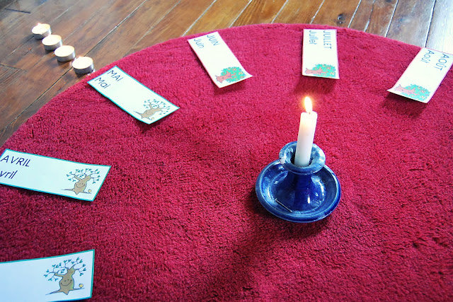 Ah, le rituel montessorien... Ma trois ans a adoré ! On a mis une bougie rose dans un pot en verre, posé sur une feuille jaune. Et on a tourné autour avec un ballon gonflable globe terrestre. Les photos étaient sur l'ordinateur, à côté des cadeaux. Et bien, elle n'a eu aucun mal à attendre ces fameux cadeaux.